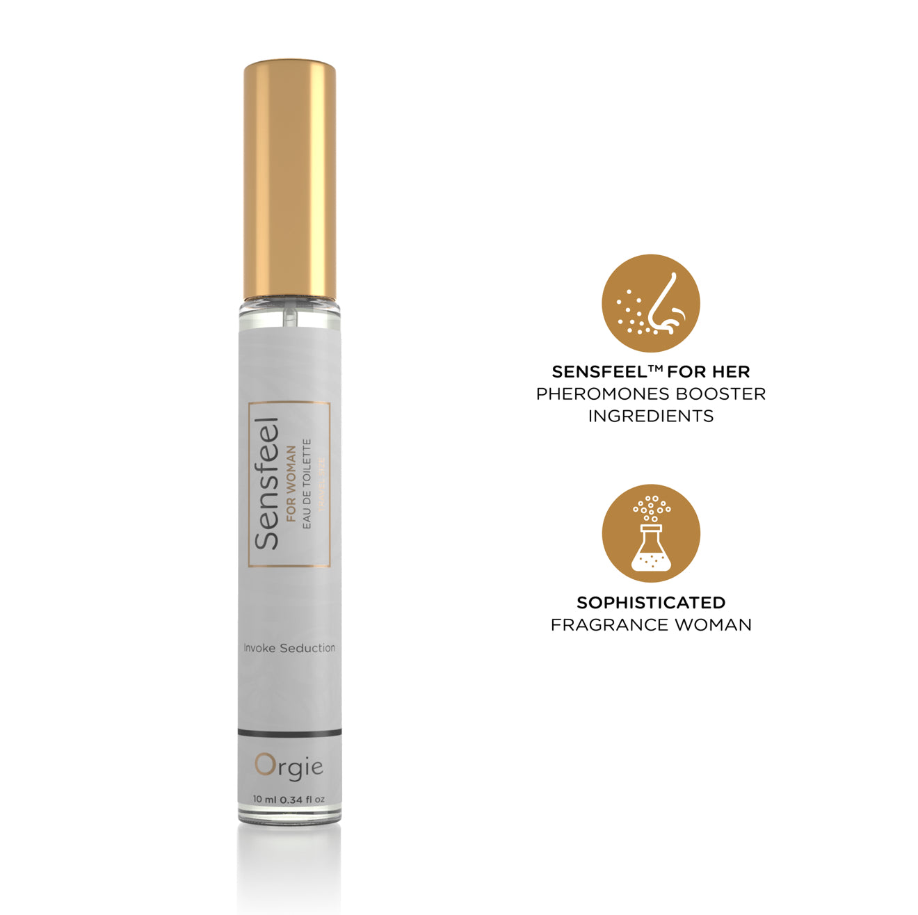 O perfume EDT Sensfeel for Woman de 10ml é uma fórmula exclusiva Orgie que contém o ingrediente ativo de base natural Sensfeel™ for Her, um potenciador de feromonas que pode aumentar a produção de testosterona nos homens através da interação de dois dos seus componentes - Jasmim Branco (Jasminum officinale) e ácidos gordos de cadeia curta (SCFAs) derivados da Alfarroba (Ceratonia siliqua) - que resulta na imitação da copulina, a feromona sexual feminina.